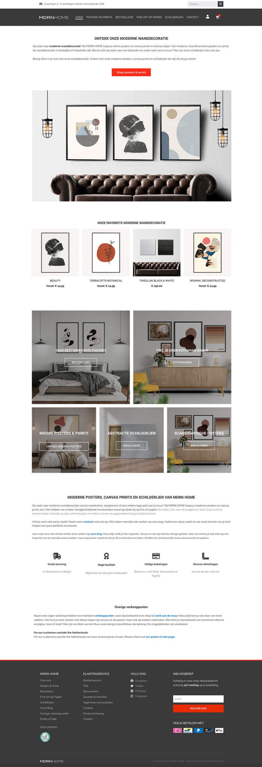 Voor moderne wanddecoratie webshop MDRN HOME ontwierp Birdie Design een minimalistisch logo ontwerp, een flyer en realiseerde een webshop die ingericht in op conversie.