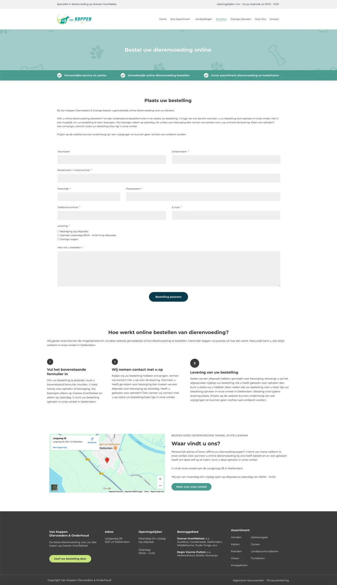 Door de beperkte capaciteit was een echte webshop niet wenselijk. Wanneer er veel bestellingen zouden binnen komen, zou de eigenaar niet aan de vraag kunnen voldoen. De dierenvoeding winkel had al veel lokale klanten, maar wilde graag ook online vindbaar zijn.